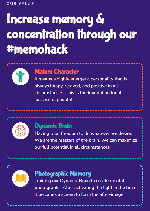 Memohack is an unconventional brain training program that will balance six areas, namely [1] Focus, [2] Receptor, [3] Emotion, [4] Comprehension, [5] Memory, and [6] Confidence. The training enhances [1] Brain Speed, [2] Brain Energy, [3] Brain Connectivity, and [4] Brain Stamina.